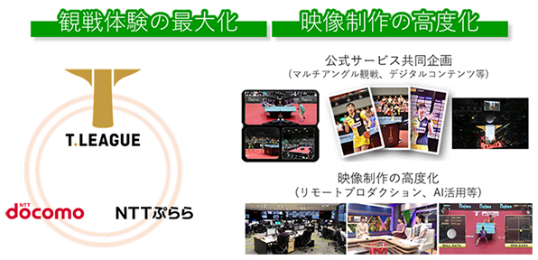 今後はTリーグとの「トップパートナー契約」および映像配信の契約に基づき、「Tリーグ」の各種プロモーション活動への協賛に加え、第5世代移動通信方式(以下、5G)、マルチアングル、360度カメラ、XR、AIハイライト※2、自動スタッツ生成※3などの先端技術を活用した公式映像の高度化と観戦体験の最大化、Tリーグの会員IDとドコモの「dアカウント®」との連携によるデジタルマーケティングの推進、公式デジタルサービスの企画・開発などに、Tリーグと共同で取り組みます。これらにより、卓球の魅力を新たな視点から、より多くの方に発信していきます。