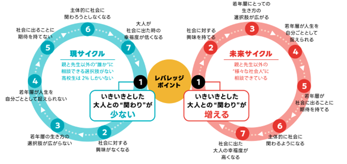我々は、「いきいきとした大人との関わりが少ない」ことが、社会に希望を見出せない若者を再生産する課題構造があると捉えています。学校や家という場を超え、生き方のモデルとなったり、刺激や学びをくれたり、自身と向き合ってくれるような社会人との継続的な繋がりを創出することが、彼らの可能性を大きく切り開くと信じています。