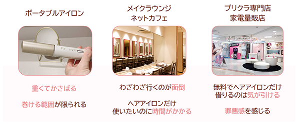現在、外出先で髪の毛を巻き直したいタイミングに備え、ポータブルヘアアイロンを持っている人および欲しいと考えたことがある人は女性全体の約8割※いることがわかっています。一方、ポータブルヘアアイロンが重く、かさばるという理由から、持ち運ぶことなく髪の毛を巻ける手段が必要とされてきました。また、ポータブルヘアアイロンを持たない女性は、メイクラウンジまで足を運びヘアアイロンを借りることや、プリクラ専門店でヘアアイロンを利用することで対応していますが、いずれも移動する手間や、うしろめたさゆえに巻き直しに関する課題があることがわかっています。