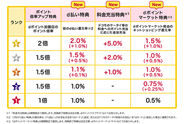 - 2024年5月15日「ドコモのポイントプログラム『dポイントクラブ』を改定」で発表した改定内容に「dポイントマーケット利用特典」を追加したものです。