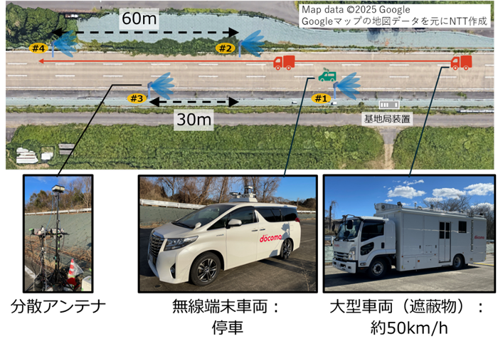日本電信電話株式会社(本社:東京都千代田区、代表取締役社長:島田 明、以下「NTT」)、株式会社NTTドコモ(本社:東京都千代田区、代表取締役社長:前田 義晃、以下「ドコモ」)、日本電気株式会社(本社:東京都港区、取締役 代表執行役社長 兼 CEO:森田 隆之、以下「NEC」)は、基地局から複数のアンテナを分散配置する40GHz帯分散MIMO※1において、適切なアンテナおよびビーム※2を高速に選択する技術と、基地局側主導で無線端末側の受信周波数や受信タイミングが大きく変化することを防ぐ周波数・タイミング補正技術により、周辺を高速移動するバスやトラックなどに遮蔽される場合や無線端末自身が高速移動する環境においても、通信品質の低下を抑制する実証実験に成功しました。これにより、自動車や列車など高速移動環境において、多数の乗客へ大容量コンテンツの提供や自動運転に向けた大容量センシングデータの収集などのユースケースに対して、ミリ波分散MIMOにより安定した大容量無線通信を実現できる可能性を示しました。