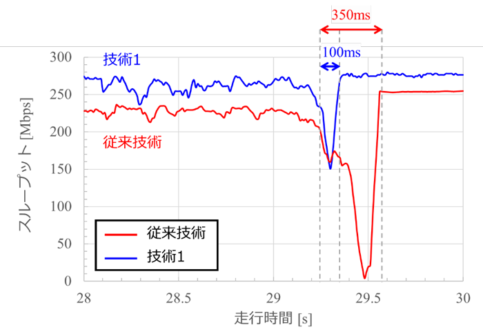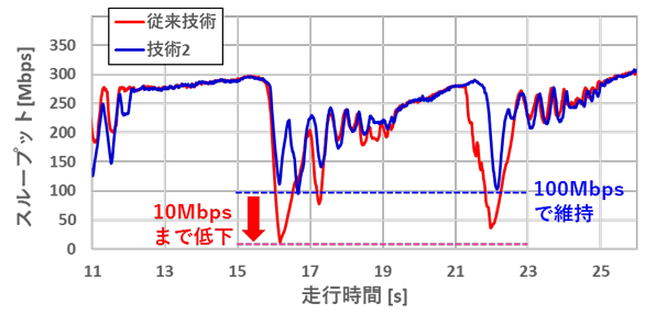 図4-2 実験結果(従来技術と技術2のスループットの比較) また、技術2の実証実験の紹介動画について以下でご覧いただけます。