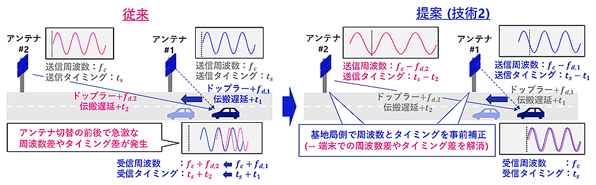 従来、無線端末は、基地局からの無線信号に対して周波数やタイミングを合わせることで、基地局との無線通信を行います。ここで、自動車や列車など高速移動体においては、移動に伴って分散アンテナの切り替えが発生しますが、無線端末に対するドップラー周波数や伝搬遅延は分散アンテナ間で異なるため、アンテナ切り替えの前後でドップラー周波数や伝搬遅延の急激な変化が発生し、通信品質の低下が課題となります。そのため、技術2では、基地局側において、受信した上り参照信号を用いて分散アンテナごとにドップラー周波数や伝搬遅延の変化を測定し、無線端末側での受信周波数や受信タイミングが一定になるように、分散アンテナ間で協調して送信周波数や送信タイミングを事前に補正します(図3)。技術2により、無線端末側では従来同様に基地局からの無線信号に対して周波数やタイミングを合わせるだけで、アンテナ切り替え時におけるドップラー周波数や伝搬遅延の変化が抑制され、無線端末に移動を感じさせないユーザセントリックな無線通信を実現します。