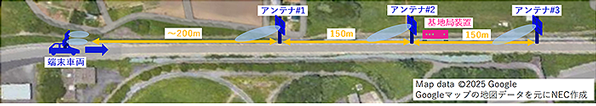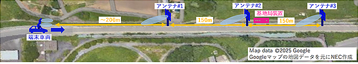 技術2の実証実験を、技術1と同様の試験走路にて、同様の実験機と無線端末車両を用いて実施しました。図4-1に示すように、高速移動環境を模擬して分散アンテナを道路の片側に150m間隔で#1~#3の位置に3台設置し、基地局と分散アンテナの接続には技術1と同様にA-RoFを用いて、無線端末車両を100km/hで走行させて下りリンクの伝送実験を行いました。