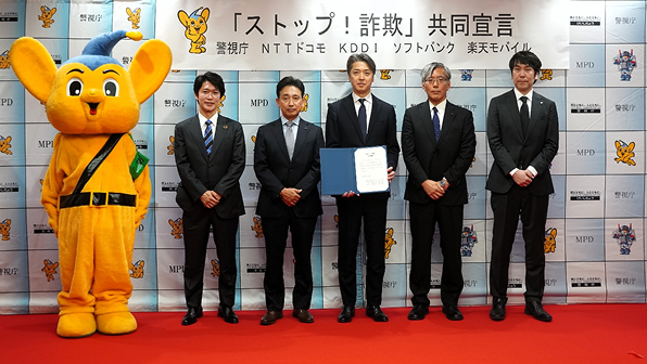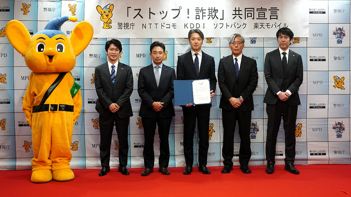 警視庁と、株式会社NTTドコモ、KDDI株式会社、ソフトバンク株式会社および楽天モバイル株式会社の携帯電話会社4社(以下、携帯4社)は、社会の安全安心を守るために協力し、特殊詐欺※の根絶に共に取り組んでいく「ストップ!詐欺」共同宣言を、2025年5月23日(金曜)に発出しました。