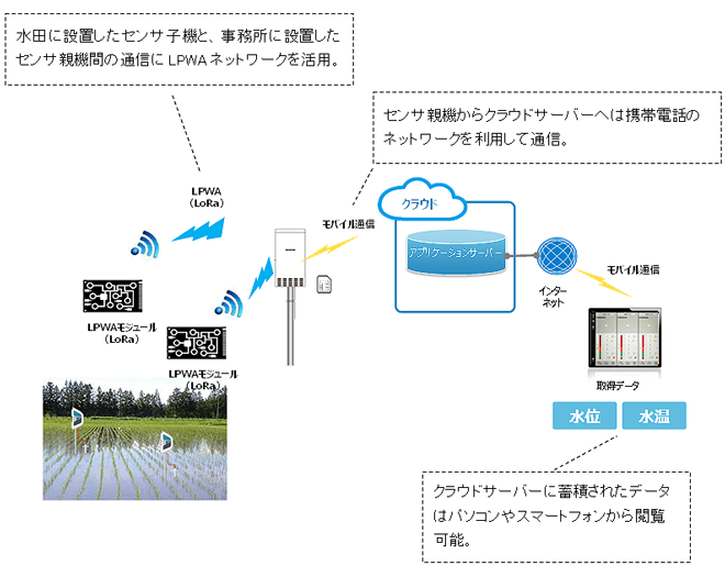 本実証実験は、水田に設置したセンサ子機と事務所に設置したセンサ親機間の通信を携帯電話のネットワークからLPWAネットワークの一つである「LoRa®」を使用することで、低コスト・省電力を実現します。