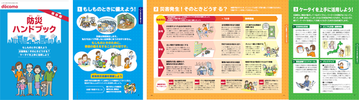 「防災ハンドブック」は、もしもの時の備えや災害発生時の対処について、また災害時のケータイ・スマートフォンを活用した情報収集手段や連絡手段などについて紹介したドコモの小冊子です。