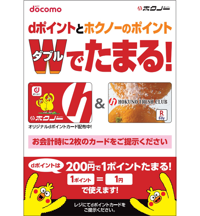 ホクノースーパーでのお支払い時にdポイントカード、dカード PLATINUM® 、dカードGOLD® 、dカード®、dカード プリペイド®(以下、dポイントカードなど)をご提示いただくことで、一回のお支払いにつき200円(税抜)ごとに1ポイントのdポイントがたまります。※1また、dポイントカードなどと同時に「ホクノーフレッシュクラブカード」をご提示いただくことで、「ホクノースーパーポイント」もたまるため、一度のお買物で、ダブルでポイントがたまります。※2
