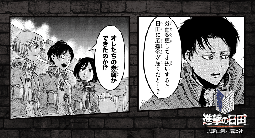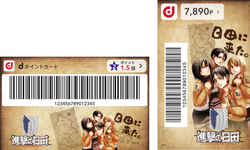 dポイントクラブアプリまたはd払いアプリで「進撃の日田」デザインを設定した上で、全国のd払い加盟店におけるd払い決済回数1回につき5円を「進撃の巨人を活用したまちおこし」の応援金として日田市へ寄付いたします。