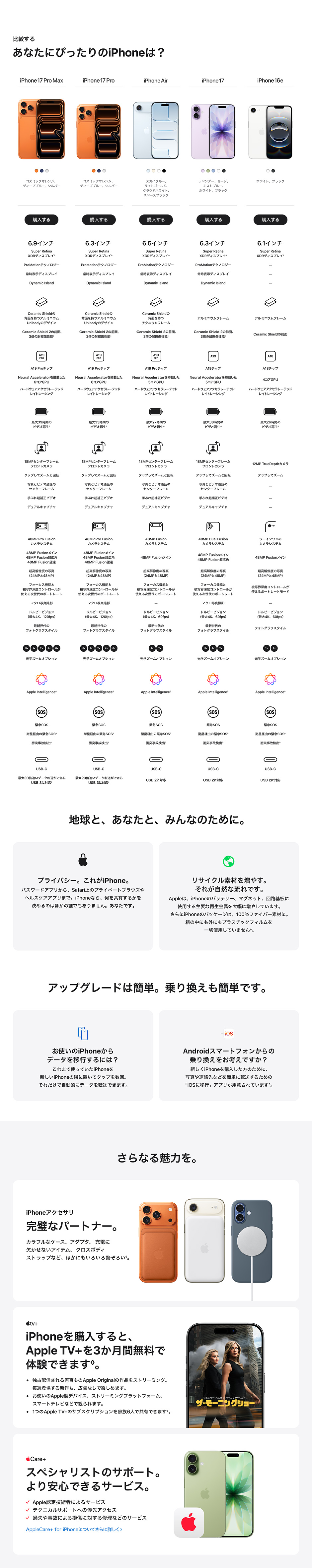 • Apple、Appleのロゴ、AirPlay、AirPods、Apple Music、Apple Pay、Apple Pencil、Apple TV、Apple Watch、Ceramic Shield、Dynamic Island、Face ID、FaceTime、iBooks、iPad、iPhone、iTunes、Lightning、Magic Keyboard、MagSafe、ProMotion、Siri、Touch ID、TrueDepth、True Toneは、米国および他の国々で登録されたApple Inc.の商標です。iPhoneの商標は、アイホン株式会社別ウインドウが開きますのライセンスにもとづき使用されています。App Store、Apple Arcade、AppleCare+、Apple TV+、iCloudは、Apple Inc.のサービスマークです。TM and © 2025 Apple Inc. All rights reserved.