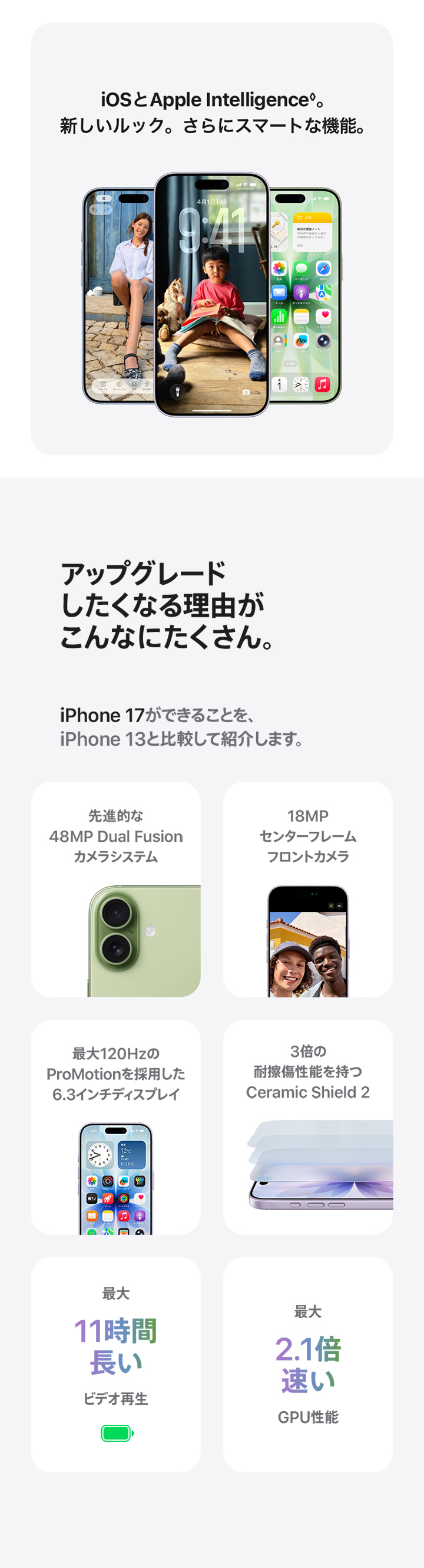 電源とバッテリー:バッテリーに関する各数値はネットワーク構成やその他の多くの要素によって変わり、実際の結果は異なる場合があります。バッテリーは充電回数に限りがあり、将来的には交換が必要になる場合があります。バッテリー駆動時間と充電サイクルは使用方法と設定によって異なります。 詳しくはapple.com/jp/batteries別ウインドウが開きますおよびapple.com/jp/iphone/battery.html別ウインドウが開きますをご覧ください。