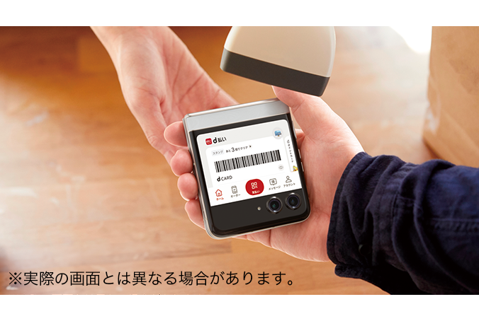 電源ボタンを2回押すと「d払い」アプリが起動。アウトディスプレイに決済バーコードを表示できるので、サッと取り出して折りたたんだままスムーズに支払いができます※1。