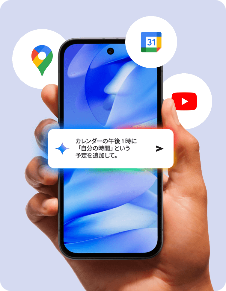 1 Gemini モバイルアプリは一部のデバイス、言語、国や地域でご利用いただけます。インターネット接続が必要です。回答の正確性をお確かめください。Gemini モバイルアプリのダウンロードが必要な場合があります。 Gemini をモバイルアシスタントとして使用するには、スマートフォンのデフォルトのアシストアプリとして Google アプリが設定されていることを確認してください。詳しくは、https://gemini.google.com/u/2/faq をご覧ください。機能はサブスクリプションによって異なり、結果は使用状況によって変わります。一部の拡張機能は設定が必要です。ご利用いただける国や地域は変わる場合があります。 2 説明を目的とした出力結果の例です。内容は状況に応じて変わります。一部の機能と特定のアカウントに対応しています。 18 歳以上の方のみがご利用いただけます。