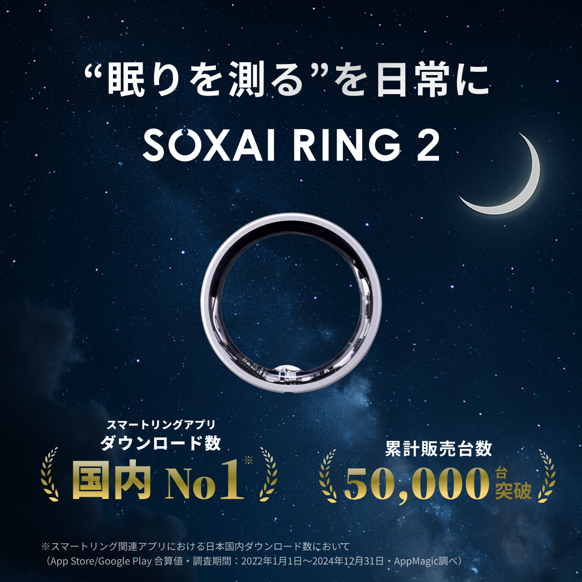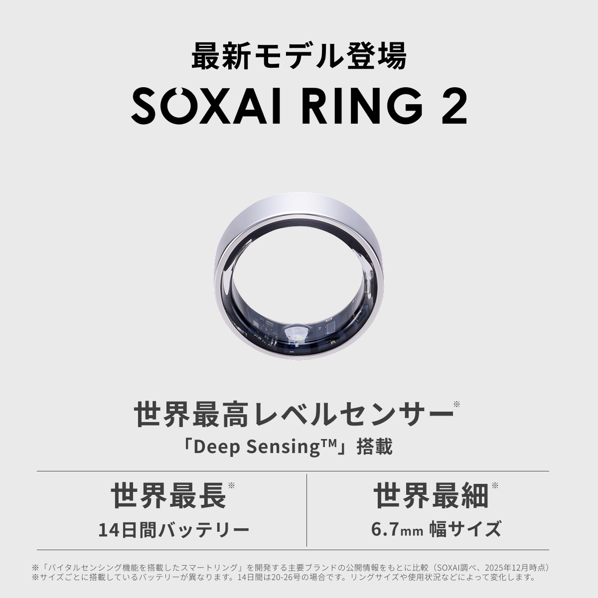 - 世界最高水準:「バイタルセンシング機能を搭載した主要スマートリングブランド」における空間分解型多波長PPG搭載の有無および構成数比較による(SOXAI調べ、2025年12月時点)