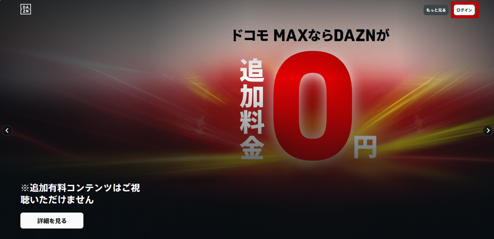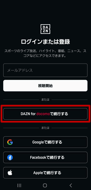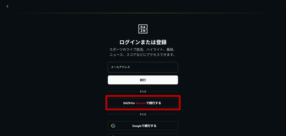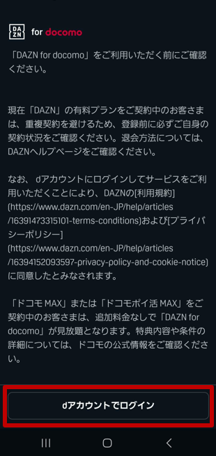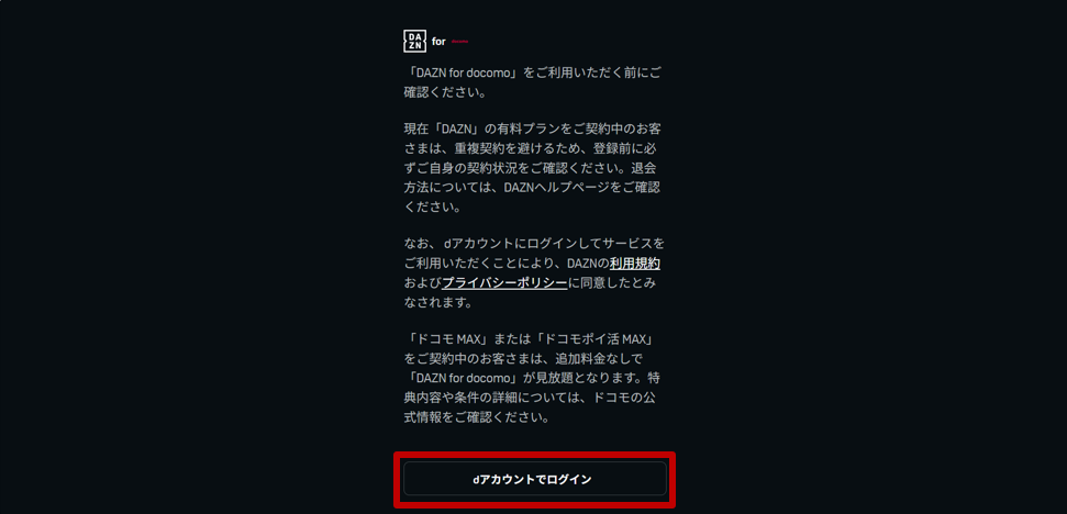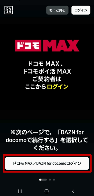 ログイン・視聴方法開く  【1】DAZNアプリを起動し、画面下部の「ドコモ MAX/DAZN for docomoログイン」を選択します。 【2】ログイン画面で「DAZN for docomoで続行する」を選択します。 【3】内容を確認の上「dアカウントでログイン」を選択します。 【4】画面の案内に沿ってdアカウントにログインしますと、DAZNアプリのトップ画面が開きますので、映像をお楽しみください。