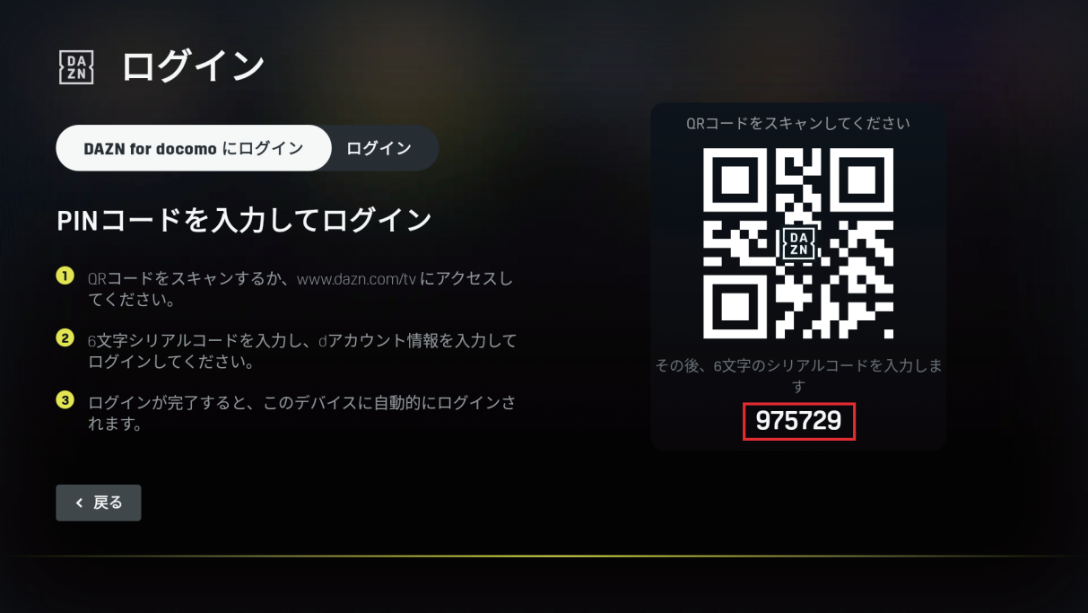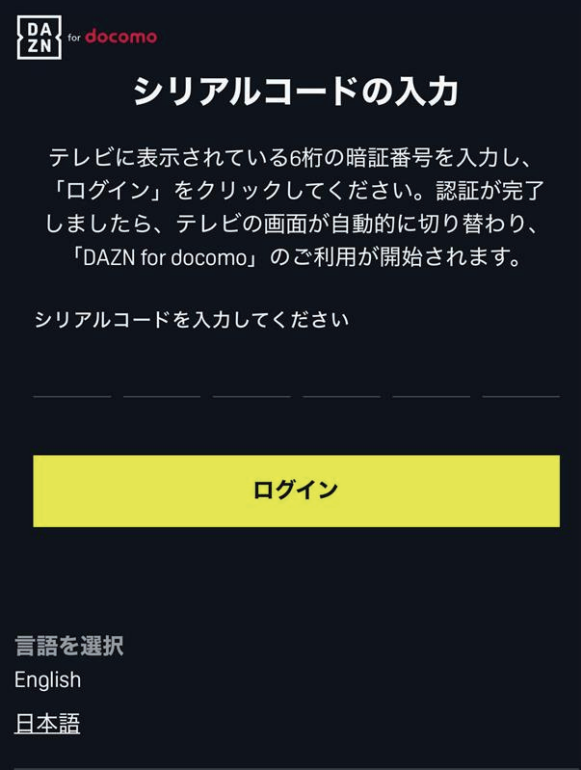 ログイン・視聴方法開く  【1】テレビのDAZNアプリよりログインする際、【DAZN for docomo】を選択してください。 【2】スマートフォン、タブレット、またはパソコンでテレビ画面に表示されているQRコードにアクセスしてください。シリアルコード入力画面につながります。 【3】テレビ画面上のDAZNアプリ、右側に表示されているQRコードの下に、6桁のシリアルコードが表示されます。こちらのシリアルコードをご入力ください。