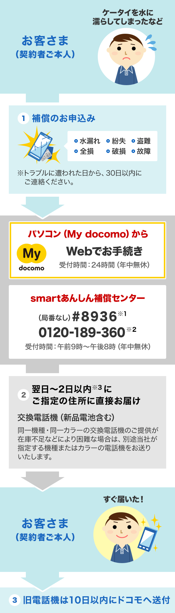 - 「ケータイ補償お届けサービス」「ケータイ補償サービス」「ケータイ補償サービス for iPhone & iPad」にて補償をご利用。