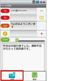 メールを転送 転送するときは 【1】受信したメールの中で転送したいメールをタップします。 【2】メニューボタンを押し「転送」をタップします。 【3】「宛先」を入力します。任意で本文を入力します。 転送メールの件名には、先頭に「Fw:」が挿入されます。 「Cc」や「Bcc」を追加する場合は追加した「TO」をタップすることにより変更可能です。 【4】「送信」をタップします。 メールを受信・操作詳細情報 メールを受信メールを返信メールを転送添付ファイルを表示添付ファイルを保存 メールを受信・操作へ戻る