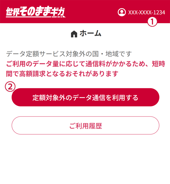 定額対象外の国・地域でのデータ通信料は従量課金対象となり通信料が高額になる恐れがあります。