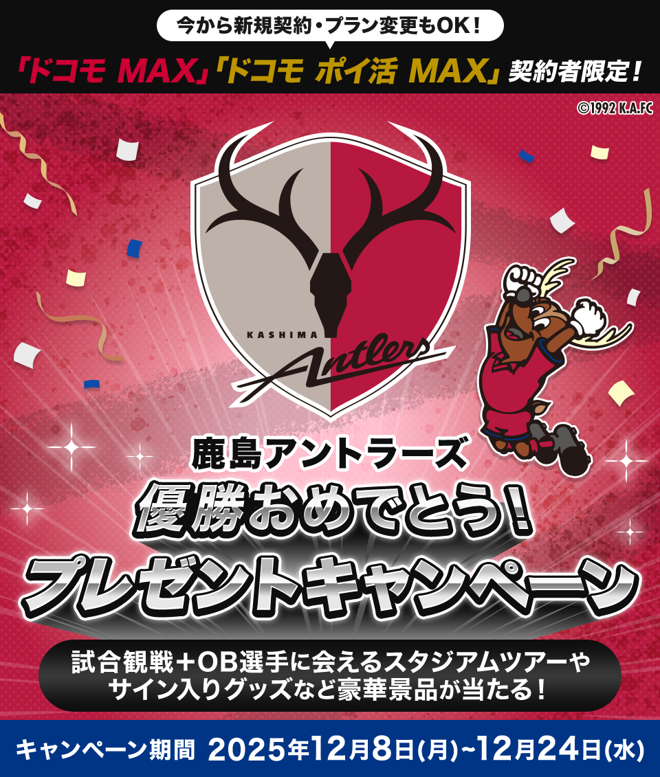 「ドコモ MAX」または「ドコモ ポイ活 MAX」ご契約者限定!鹿島アントラーズを応援してくださった皆様へ、Tシャツ、タオル、dポイント(期間・用途限定)等の豪華賞品が当たるキャンペーンを実施中。