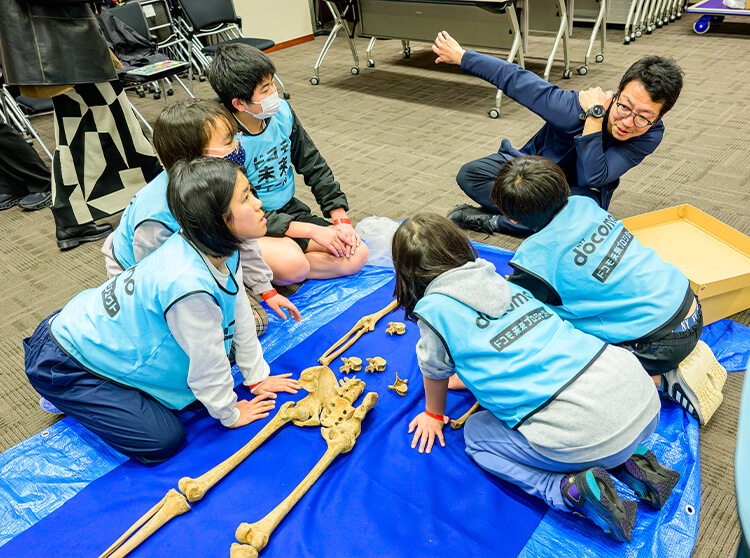 森田さんから人類学を学んだ後は、本物の人骨標本を使ったワークショップがスタート!国立科学博物館のスタッフにサポートいただきながら、班にわかれてそれぞれ渡された骨を、人間の形に並べるワークショップです。