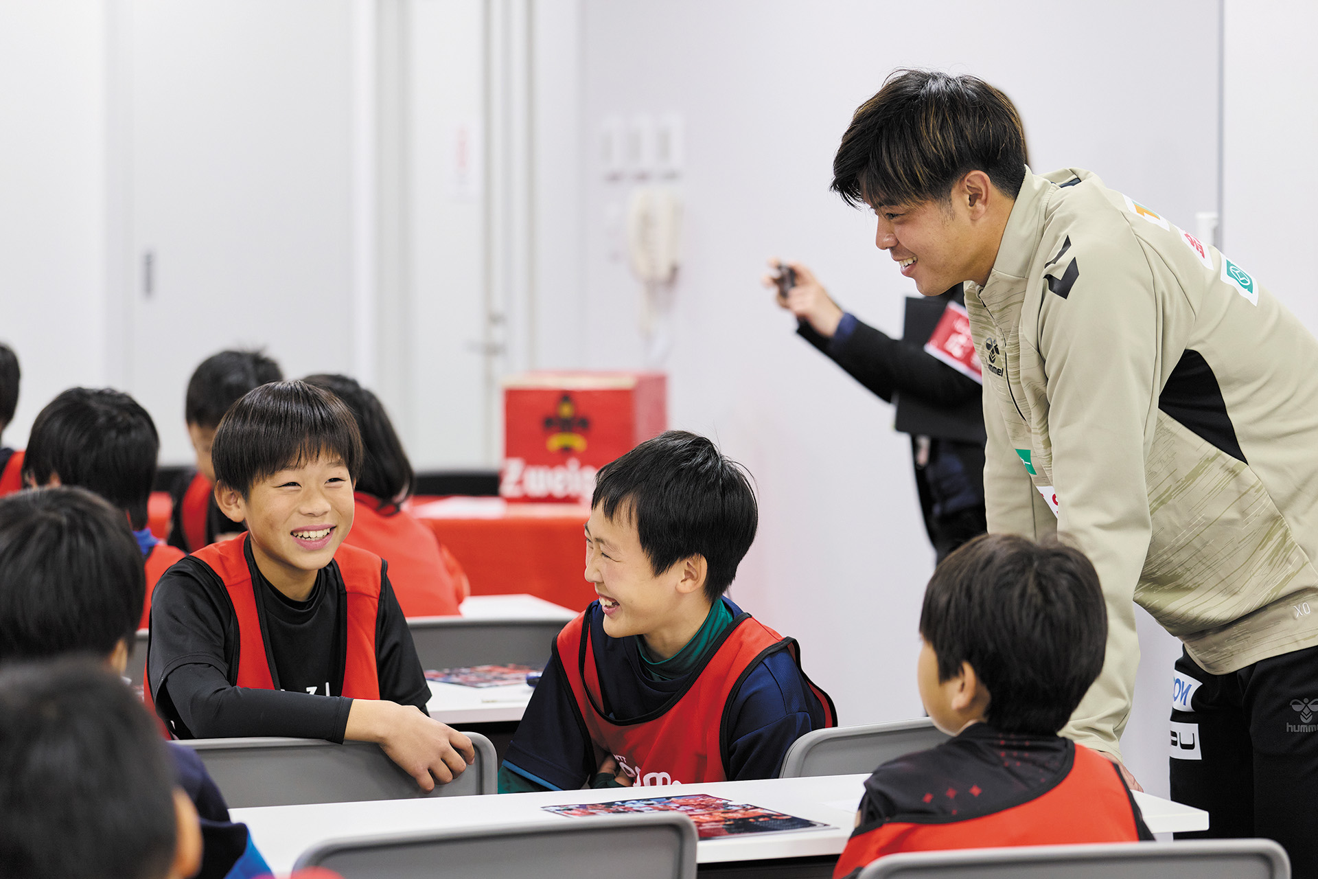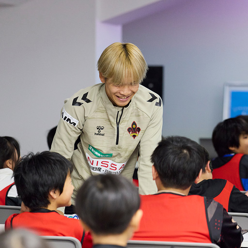サッカー教室で憧れの選手と一緒に練習し、プロの世界に触れた子どもたち。気持ち良い汗を流した後は、廣井クラブキャプテンが自身の体験談を語り、子どもたちの職業観を育む講話を行いました。「仕事とは自分の好きを通じて周りの人々を笑顔にすること。」この廣井さんの言葉に子どもたちの仕事に対するイメージが変わったようです。その後は現役プロ選手との交流会。普段は聞けないプロの話を、自由に質問しながら楽しみました。