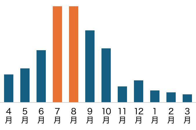 お客さまからの「スマホの発熱」に関するお申出の件数も、グラフのように気温の上昇とともに増加し、7月~8月がピークとなっております。