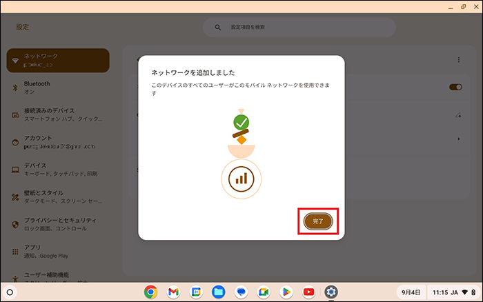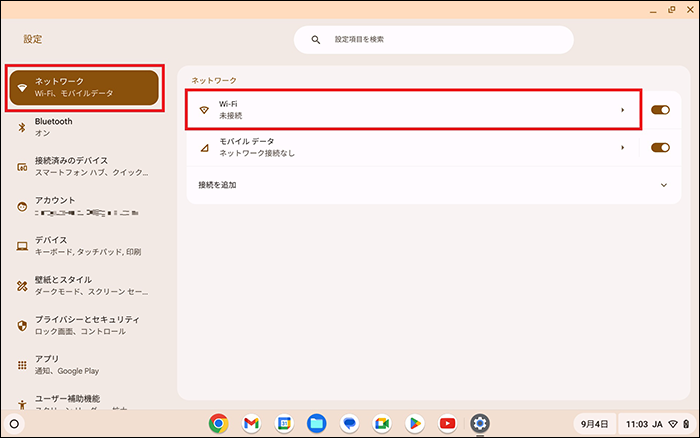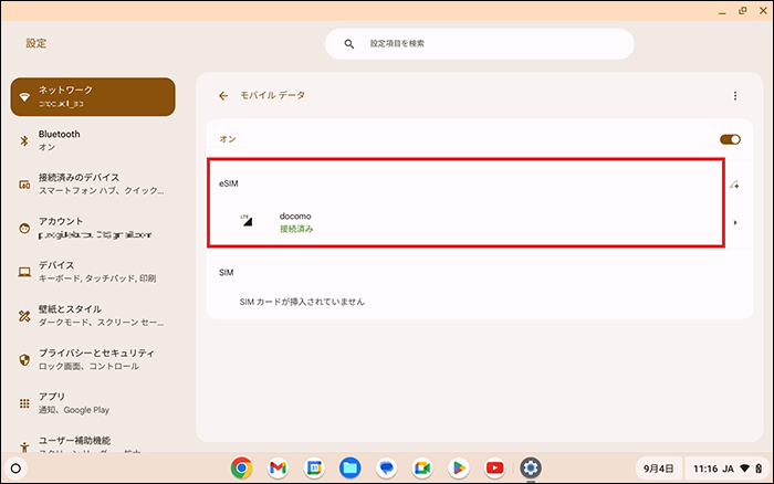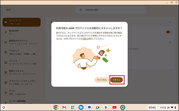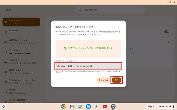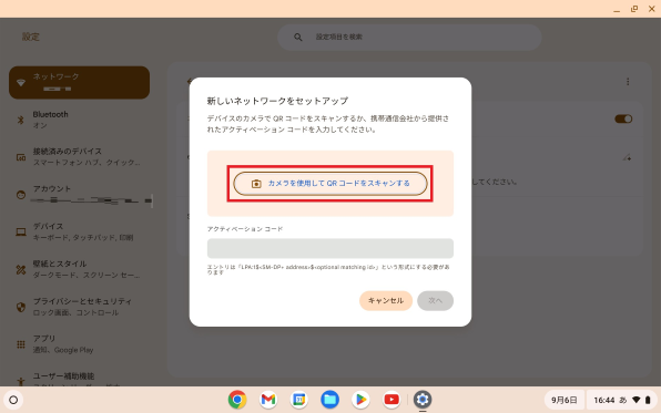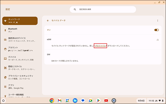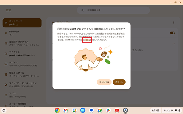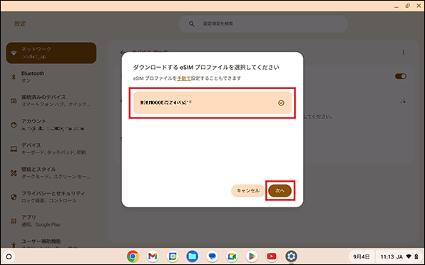 Chromebookを起動し、初期設定を実施したのちeSIM開通を行います。eSIM開通時は、Wi-Fiの接続が必須です。