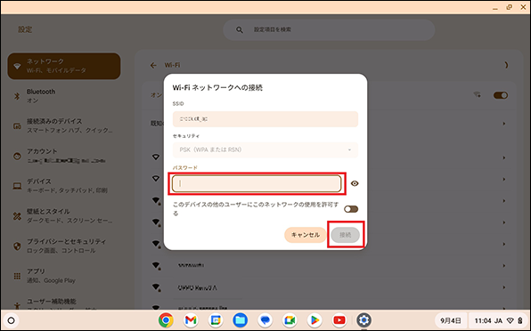 【4】Wi-Fiネットワークのパスワードを入力し、「接続」を選択します。