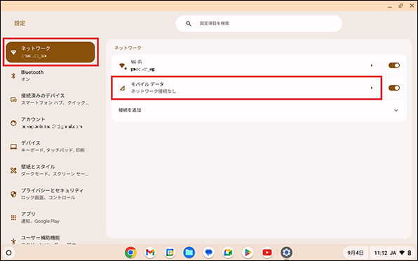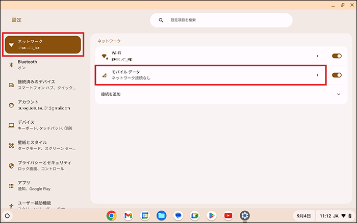 【2】「ネットワーク」を選択し、「モバイルデータ」を選択します。